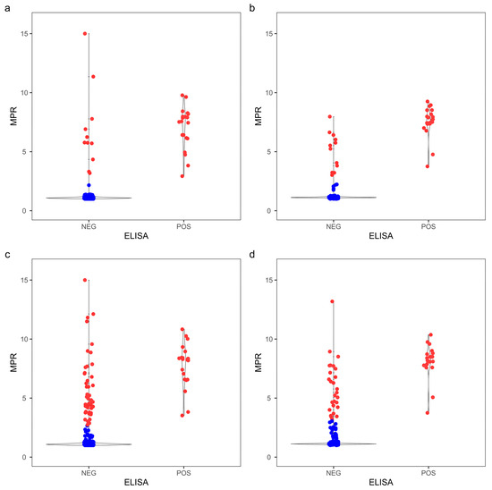 Max-point ratio distributions of 104 obex and RLN white-tailed deer samples from a CWD-affected farm. MPR values from quadruplicate reactions from 104 samples were determined at 102 cycles (29 h) with obex (a), 110 cycles (32 h) with RLN (b), 40 h with obex (c), and 40 h with RLN (d). Replicates in red surpassed TMPR within the assay duration, whereas replicates in blue did not cross TMPR. TMPR was defined as 3.36 and 2.00 for obex and RLN at optimal durations, respectively, and 3.36 and 2.54 at 40 h for obex and RLN, respectively.