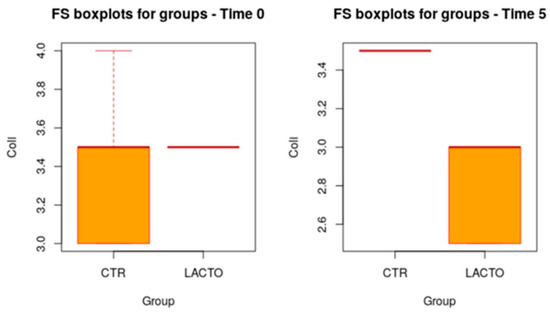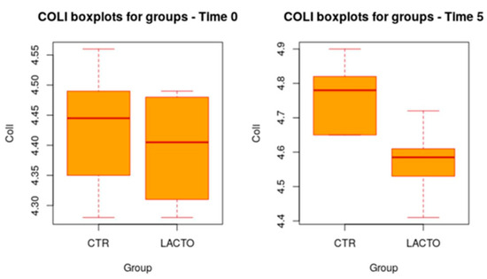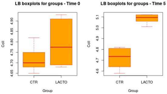 In addition, at the end of the study (T5), a more significant increase in Lactobacilli was reported in the experimental group (LACTO) than in the control group (p > 0.001), moving from a concentration of 4.75 ± 0.10 log CFU/g (p = 0.977) at the beginning of the experiment to a concentration of 5.04 ± 0.10 log CFU/g (p > 0.001) at the end of the trial (Table 6; Figure 2). Total coliforms show a very small increase (p = 0.011) (Table 7; Figure 3).