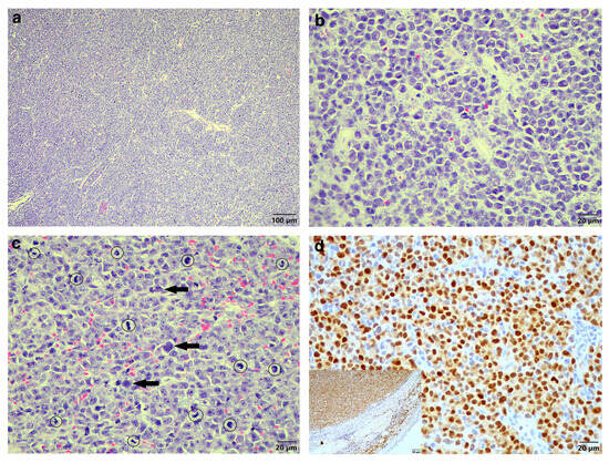 An approximately 2-year-old female wild Cape serotine bat (Laephotis capensis) that had been caught by a domestic cat in Velddrif, Western Cape, South Africa, was presented to the veterinarian for medical care associated with the cat bite. At the time of examination, a mass (~1.5 cm2) was noted on the skin over the left lateral chest area. The bat was treated symptomatically and was placed on antibiotic therapy prophylactically for the cat bite and taken to a bat rehabilitation centre in Gauteng (Think Bat; https://thinkbat.org/, accessed on 15 December 2023 ). Despite the weeklong treatment, the mass had not decreased in size. A fine-needle aspiration was performed on the mass, and the cytology smears showed the presence of small neoplastic round cells. To aid the diagnosis, an incisional biopsy of the mass was subsequently performed and submitted to the Histopathology Laboratory of the Faculty of Veterinary Science, University of Pretoria for routine histopathology. Sections (4 μm) were stained with haematoxylin and eosin (HE).