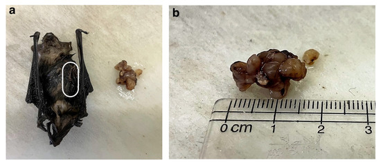 A conservative treatment regime was administered to the bat at the rehabilitation centre, which included daily castor oil compresses to the mass and administration of vitamin C. However, the condition of the bat kept deteriorating, showing loss of body weight, poor appetite, and nausea, as well as isolating itself from the other bats. Two weeks later, the bat was anaesthetised, and the 1.5 × 1.0 cm lobulated mass was surgically excised (Figure 2a,b).