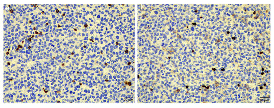 MUM1, encoded by the IRF4 gene, is a regulatory protein involved in the differentiation of B-lymphocytes to plasma cells and is required for immunoglobulin light-chain rearrangement. It is useful to identify plasmacytomas, MMs, and B-cell lymphomas in both canines and felines [6,14,19]. Indeed, of the B-cell markers commonly used in veterinary species, MUM1 is the preferred plasma cell marker for normal and neoplastic plasma cells, with one study reporting 84% of plasma cell tumours showing positive labelling, compared to 59/105 (56%) for CD79a and 21/108 (19%) for CD20 [39]. Furthermore, the study found that canine lymphomas that express MUM1 are few and typically of B-cell origin, and other canine leukocytic and melanocytic tumour do not express MUM1 [39]. The study concluded that mouse monoclonal antibody Mum-1p (which was used in this case report) is very specific for canine plasmacytomas and is superior in sensitivity and specificity to CD79a and CD20 for the identification of canine plasmacytomas in formalin-fixed, paraffin-embedded tissues [39]. Labelling is typically nuclear with a weak cytoplasmic component [6,39], which is consistent with that seen in this case report. This is the first reported use of MUM1 immunohistochemistry in a bat.