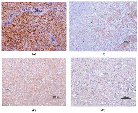(A) COX-2 immunolabeling (brown staining) with high extension and strong intensity. Cytoplasmatic and perinuclear staining are present; (B) low extension of labeling with most tumoral cells being negative and some cells presenting weak-to-moderate staining in the cytoplasm and perinuclear region; (C) diffuse cytoplasmatic staining with moderate intensity; (D) cytoplasmatic staining with weak intensity.