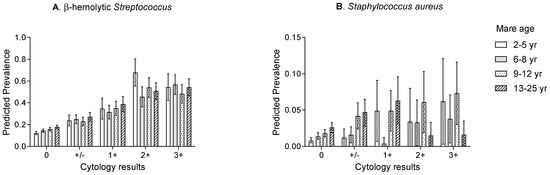 3.4. Prevalence of Endometrial Isolates stratified by Year of Sampling, Mare Age, and Inflammatory Response
