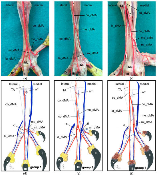 Right leg, region of tarsometatarsus, dorsal aspect. (a–c) Photographs after removal of skin and tendons, arteries filled with red-colored latex. (d–f) Semi-schematic drawings, arteries painted in red, veins in blue. (a,d) Peregrine falcon; (b,e) northern goshawk; (c,f) Eurasian eagle–owl. TA—cranial tibial artery; co_dMA—common dorsal metatarsal artery; la_dMA—lateral dorsal metatarsal artery; me_dMA—medial dorsal metatarsal artery (X: incomplete filling in (b)); mi_dMA—middle dorsal metatarsal artery; a—proximal intermetatarsal arteries; c—distal intermetatarsal artery; g—branch from me_dMA joining me_DA1; r—lateral proximal intermetatarsal vein; TJ—intertarsal joint; MJ—level of metatarsophalangeal joints; *—tendon of insertion of the cranial tibial muscle (removed in (a)); I–IV—1st–4th toe.