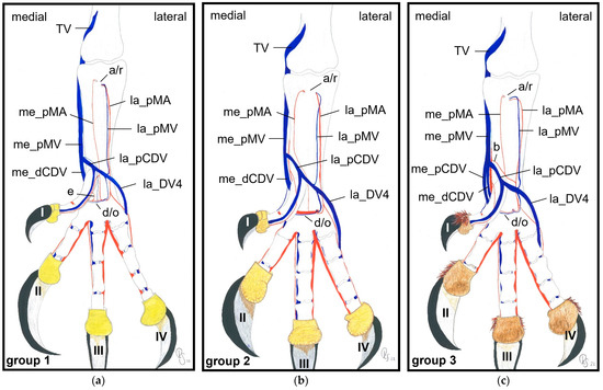 In summary, the main arterial supply of the foot was provided by one common artery on the dorsal side of the tarsometatarsus in all species examined. Based on the position of the splitting of this common metatarsal artery into three dorsal metatarsal arteries, three groups of species were differentiated (Figure 17). The digital arteries arose directly from the metatarsal arteries or were prolongations of these arteries. The plantar position of the first toe required a course of the supplying arteries to the plantar side, with the origin of the digital arteries varying in a species-specific manner. In all species examined, one artery and one vein were found on the medial and lateral sides of each toe, which showed a reciprocal asymmetry of their size. In contrast to the arteries, digital veins (Figure 18) basically united to form common digital veins, which drained into four metatarsal veins. The major difference between species involved the presence of the me_DV1 and the formation of the me_pCDV (Figure 18b–d). The strong medial plantar metatarsal vein provided the main drainage of the foot. In conclusion, there was not as much difference between species in the veins of the foot as there was in the arteries.