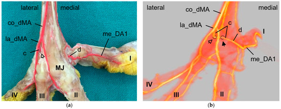 Right foot, region of metatarsophalangeal joints, dorsomedial aspect: (a) common buzzard, photograph after removal of skin and tendons, arteries filled with red-colored latex; (b) barn owl, micro-computed tomography 3D reconstruction, arteries filled with contrast medium, toes fixed with tape. co_dMA—common dorsal metatarsal artery; la_dMA—lateral dorsal metatarsal artery; me_DA1—medial digital artery of the first toe; c—distal intermetatarsal artery (runs between marked openings of the distal vascular foramen (open circles), visible in (b) because of transparent bone tissue in micro-computed tomography 3D reconstruction); unfilled arrow—indicates dorsal opening of distal vascular foramen; filled arrow—indicates plantar opening of distal vascular foramen; d—arterial plantar arch (visible in (b) because of transparent bone tissue in micro-computed tomography 3D reconstruction); MJ—level of metatarsophalangeal joints; I–IV—1st–4th toe.