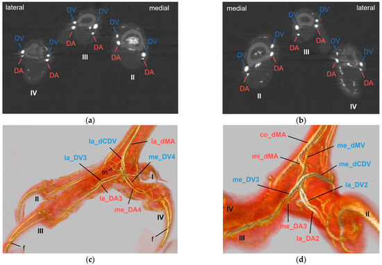 Digital arteries (labeled in red) and digital veins (labeled in blue) showing a reciprocal asymmetry in their size: (a,b) micro-computed tomography cross-section through toes II–IV, arteries and veins filled with contrast medium; (c,d) image of micro-computed tomography 3D reconstruction, arteries and veins filled with contrast medium, toes fixed with tape; (a) northern goshawk, right foot, proximal aspect; (b) northern goshawk, left foot, proximal aspect; (c) Eurasian eagle–owl, left foot, dorsolateral aspect; (d) common buzzard, right foot, dorsomedial aspect. co_dMA—common dorsal metatarsal artery; la_dMA—lateral dorsal metatarsal artery; mi_dMA—middle dorsal metatarsal artery; la_dCDV—lateral dorsal common digital vein; me_dCDV—medial dorsal common digital vein; me_dMV—medial dorsal metatarsal vein; la_DA2—strong lateral digital artery of the second toe; la_DV2—small lateral digital vein of the second toe; la_DA3—strong lateral digital artery of the third toe; me_DA3—small medial digital artery of the third toe; la_DV3—small lateral digital vein of the third toe; me_DV3—strong medial digital vein of the third toe; me_DA4—strong medial digital artery of the fourth toe; me_DV4—small medial digital vein of the fourth toe; f—arteriovenous anastomosis between digital artery und digital vein in the distal phalanx of each toe; DA—digital artery; DV—digital vein; I–IV—1st–4th toe.