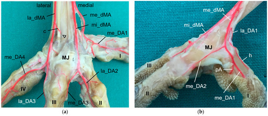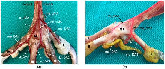 Right foot, region of the metatarsophalangeal joints after removal of skin and tendons, arteries filled with red-colored latex: (a) gyr–saker falcon, dorsal aspect; (b) peregrine falcon, medial aspect. la_dMA—lateral dorsal metatarsal artery; me_dMA—medial dorsal metatarsal artery; mi_dMA—middle dorsal metatarsal artery; me_DA1—medial digital artery of the first toe; la_DA2—lateral digital artery of the second toe; me_DA2—medial digital artery of the second toe (very small in (b)); la_DA3—lateral digital artery of the third toe; me_DA3—medial digital artery of the third toe; me_DA4—medial digital artery of the fourth toe; pA—arterial pulvinar branch; c—distal intermetatarsal artery passing from dorsal to plantar side through the distal vascular foramen; unfilled arrow—indicates dorsal opening of distal vascular foramen; MJ—level of metatarsophalangeal joints; I–IV—1st–4th toe.