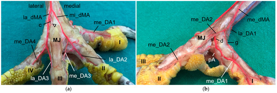 Right foot, region of the metatarsophalangeal joints after removal of skin and tendons, arteries filled with red-colored latex: (a) common buzzard, dorsal aspect; (b) common buzzard, medial aspect. la_dMA—lateral dorsal metatarsal artery; me_dMA—medial dorsal metatarsal artery; mi_dMA—middle dorsal metatarsal artery; la_DA1—lateral digital artery of the first toe; me_DA1—medial digital artery of the first toe; la_DA2—lateral digital artery of the second toe; me_DA2—medial digital artery of the second toe, la_DA3—lateral digital artery of the third toe; me_DA3—medial digital artery of the third toe; me_DA4—medial digital artery of the fourth toe; pA—arterial pulvinar branch; c—distal intermetatarsal artery passing from dorsal to plantar side through the distal vascular foramen; d—arterial plantar arch; g—branch from me_dMA joining me_DA1; unfilled arrow—indicates dorsal opening of distal vascular foramen; MJ—level of metatarsophalangeal joints; I–IV—1st–4th toe.