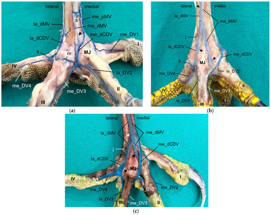Right foot, region of the metatarsophalangeal joints, dorsal aspect after removal of skin and tendons, veins filled with blue-colored latex: (a) Eurasian eagle–owl; (b) common buzzard; (c) peregrine falcon. la_dMV—lateral dorsal metatarsal vein; me_dMV—medial dorsal metatarsal vein; arrows—collateral dorsal metatarsal branches; me_pMV—medial plantar metatarsal vein; la_dCDV—lateral dorsal common digital vein; me_dCDV—medial dorsal common digital vein; me_DV1—medial digital vein of the first toe; la_DV2—lateral digital vein of the second toe (incomplete filling in (b,c)); me_DV2—medial digital vein of the second toe; la_DV3—lateral digital vein of the third toe; me_DV3—medial digital vein of the third toe; me_DV4—medial digital vein of the fourth toe; j—distal intermetatarsal vein passing through the distal vascular foramen; k—anastomosis between la_dCDV and la_DV4; m—anastomosis between me_dCDV and la_dCDV; s—anastomosis between me_pMV and me_dMV; MJ—level of metatarsophalangeal joints; I–IV—1st–4th toe.