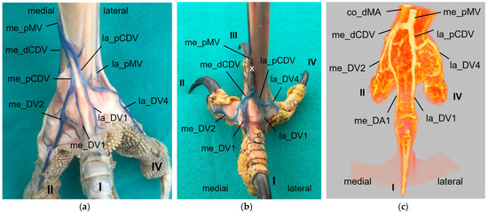 Right foot, region of the metatarsophalangeal joints, plantar aspect: (a,b) photographs after removal of the skin, veins filled with blue-colored latex. (a) Eurasian eagle–owl, (b) common buzzard, (c) peregrine falcon, micro-computed tomography 3D reconstruction, arteries and veins filled with contrast medium, toes fixed with tape. co_dMA—common dorsal metatarsal artery; la_pMV—lateral plantar metatarsal vein; me_pMV—medial plantar metatarsal vein (X: incomplete filling in (b)); me_dCDV—medial dorsal common digital vein; la_pCDV—lateral plantar common digital vein; me_pCDV—medial plantar common digital vein; la_DV1—lateral digital vein of the first toe; me_DA1—medial digital artery of the first toe; me_DV1—medial digital vein of the first toe; me_DV2—medial digital vein of the second toe; la_DV4—lateral digital vein of the fourth toe; I–IV—1st–4th toe.