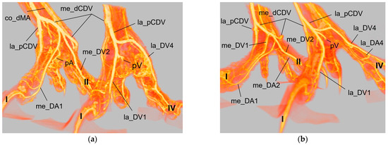A venous pulvinar branch (pV) arose either from the la_DV1 or la_DV4 or the point of their confluence (Figure 12 and Figure 13b,c). This strong branch was visible in all examined species.