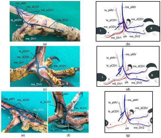 On the dorsal side of the foot at the level of the metatarsophalangeal joints, or slightly more proximal, the two dorsal common digital veins gave rise to the la_dMV and me_dMV, which were present in all species examined (Figure 10). In their proximal course, these slender dorsal metatarsal veins split into several small veins running parallel and accompanying the dorsal metatarsal arteries underneath the extensor tendons along the dorsal side of the tarsometatarsus (Figure 10 and Figure 16). The dorsal metatarsal veins showed various veno-venous anastomoses with each other as well as to the me_pMV (Figure 10a and Figure 16a,c,d).