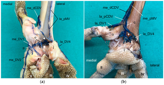 Right foot, region of the metatarsophalangeal joints and metatarsal foot pad. (a,b) Eurasian eagle–owl, veins filled with blue-colored latex: (a) lateral aspect, photograph after removal of the skin; (b) plantolateral aspect, first toe displaced to the left, photograph after removal of skin and tendons; (c) peregrine falcon, lateral aspect, semi-schematic drawing, arteries painted in red, veins in blue. la_pMV—lateral plantar metatarsal vein; me_pMV—medial plantar metatarsal vein; la_pCDV—lateral plantar common digital vein; me_dCDV—medial dorsal common digital vein; la_DV1—lateral digital vein of the first toe; la_DV4—lateral digital vein of the fourth toe; pV—venous pulvinar branch; j—distal intermetatarsal vein passing through the distal vascular foramen (filled arrow); k—anastomosis between la_dCDV and la_DV4; o—venous plantar arch; q—additional vein from venous plantar arch that joined me_dCDV; *—flexor tendons (removed in (b)); I–IV—1st–4th toe.