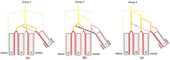 Schematic drawing of basic pattern of metatarsal and digital arteries, right foot, dorsal aspect, first toe displaced medially: (a) peregrine falcon, gyr–saker falcon, and common kestrel (group 1); (b) northern goshawk, common buzzard, and barn owl (group 2); (c) Eurasian eagle–owl and long-eared owl (group 3). Yellow-filled lines—common dorsal metatarsal artery (co_dMA); orange-filled lines—dorsal metatarsal arteries (la/me/mi_dMA); orange dotted lines—plantar metatarsal arteries (la/me_pMA); red-filled lines—digital arteries arising from dorsal side; red dotted lines—digital arteries arising from plantar side; black dotted lines—distal intermetatarsal artery passing through the marked (open circle) distal vascular foramen and continuing as arterial plantar arch; I–IV—1st–4th toe.