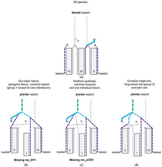 Schematic drawing of basic pattern of metatarsal and digital veins, right foot, digital veins that continue as dorsal metatarsal veins demonstrated in filled lines, digital veins that emerge to the plantar side and continue as plantar metatarsal veins in dotted lines: (a) dorsal aspect, all species; (b–d) plantar aspect; (b) gyr–saker falcon, peregrine falcon, and common kestrel (group 1 except for one individuum); (c) northern goshawk, common buzzard, and one individual falcon; (d) Eurasian eagle–owl, long-eared owl (group 3), and barn owl. Light-green-filled lines—dorsal metatarsal veins (la/me_dMV); dark-green dotted lines—plantar metatarsal veins (la/me_pMV); filled or dotted light blue lines—common digital veins (la/me_d/pCDV); filled or dotted dark-blue lines—digital veins (la/me_DV1-4); black dotted lines—distal intermetatarsal vein passing through the marked (open circle) distal vascular foramen originating from the venous plantar arch; I–IV—1st–4th toe.