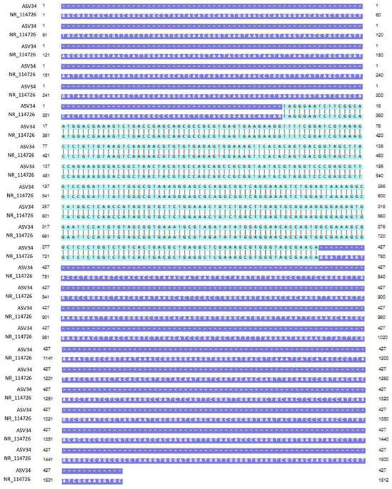 Nucleotide sequence alignment. Alignment of the ASV34 sequence identified from the 16S amplicon of dental plaque bacteria with the oral S. mutans sequence reported in GenBank (strain NCTC 10449 16S ribosomal RNA, Accession; NR_114726). The light-green region is the part where the two nucleotide sequences match.