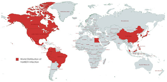All examined chicken flocks exhibited respiratory and digestive disorders, along with postmortem lesions including bursa of Fabricius atrophy, enteritis, pneumonia, tracheitis, fibrinous airsacculitis, perihepatitis and pericarditis, exemplifying complicated chronic respiratory disease (CCRD), with low mortality rates ranging from 0.3 to 2% within five days of the disease course. The assessment of 18 vaccinated chicken flocks aged between 19 and 49 days for IBDV infection using rRT-PCR showed non-vvIBDV in all bursal samples. Moreover, rRT-PCR for other viral diseases disclosed exclusively low pathogenic avian influenza subtype H9N2 (LPAI-H9N2) in all broiler samples (n = 15), alongside the suspected CCRD following postmortem examination. Isolation of IBDV in 12-day-old SPF-ECE through inoculation of tissue homogenates via chorioallantoic membrane caused embryonic mortalities within 5 days post-inoculation. The dead embryos exhibited lesions of dwarfing accompanied by congestion and hemorrhages. Real-time RT-PCR detected a non-very virulent infectious bursal disease virus in all samples. Partial sequence analysis of VP2 (219 amino acids, residues 147–366, resembling 657 base pairs) in two isolates (No. 3 and 4) confirmed the detection of the variant infectious bursal disease virus (genotype A2d). Both isolate sequences were submitted to GenBank with the accession numbers OR682618 and OR682619, respectively. The distribution of variant IBDV infections worldwide is indicated in Figure 1. The phylogenetic analysis of A2d classified isolates with other nine genotypes of segment B (A genotype) is indicated in Figure 2. Both isolates were closely related to nVarIBDV strains (A2d) circulating in China, as they shared 100% identity with IBD/SD/LY/CN/01/2020 (accession no. OM307063), were 99.5% similar to ZD-2018-1 (accession no. MN485882) and had 98.1–98.6% similarity to the QZ, GX, and SG19 strains, respectively. Also, both obtained nVarIBDV isolates showed 93.6–97.2% similarity to the USA variant strains A2b (9109), A2c (GLS), and A2a (variant E), as demonstrated in Figure 3.