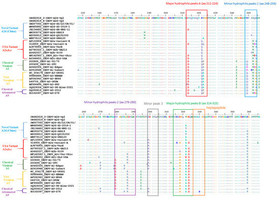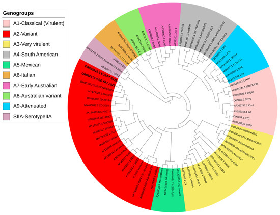 Two Egyptian Infectious bursal disease virus (IBDV) isolates, numbers 3 and 4, underwent partial sequencing of 219 amino acids (147–366, equivalent to 657 base pairs) that encompassed the hypervariable region of VP2 (VP2-HVR, amino acids 210–350) using the Kylt® RNA/DNA Purification Kit (SAN Group Biotech Gmb, HHöltinghausen, Germany) following the procedure of the manufacturer. The purified PCR products underwent direct sequencing using the ABI PRISM-BigDyeTM Terminators v3.1 Cycle Sequencing Kit (Applied Biosystems, Foster City, CA, USA) and the ABI PRISM 3130 genetic analyzer (Applied Biosystems). The sequences underwent editing utilizing SeqScape-Software Version 2.5 (Applied Biosystems). The assembly of consensus sequences and alignment trimming were subsequently performed through employment of the Laser gene DNASTAR program suite (DNASTAR Inc., Madison, WI, USA). The Clustal V technique was used for this process [40]. To locate other related IBDV nucleotide sequences, the nucleotide sequences used in the study underwent blasting through the National Center for Biotechnology Information (NCBI) website (http://www.ncbi.nlm.nih.gov/), accessed on 30 November 2023. Phylogenetic analysis comprised of two nVarIBDV isolates and 91 IBDV sequences downloaded from GenBank, which included 42 isolates from USA variant A2a,b,c, 49 isolates from novel variants (China) A2d, and 53 isolates from other genotypes A1, A3–9 and SIIA. In addition, an alignment comparison was made between the two nVarIBDV and 25 strains (including novel, US variants, classical virulent and attenuated, and vvIBDV) containing 219 amino acids (147–366), including the VP2-HVR (aa 210–350). The nucleotide sequences were uploaded and analyzed through BioEdit (Ibis Bioscience, Carlsbad, CA, USA) and Geneious Prime v 1.0.2022 software packages for molecular evolutionary genetics. Subsequently, the Interactive Tree of Life (iTOL) v5 program was employed to generate phylogenetic trees and annotation, following the methodology proposed by [41].