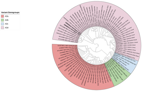 Phylogenetic analysis (polar format) of two nVarIBDV isolates (Accession no. OR682618 and OR682619) isolated in 2023 (bold letters) compared to other IBDV isolates from different genogroups. Interactive Tree of Life (iTOL) v5 program was used to produce phylogenetic tree. Bootstrapping using UFBoot2 method was applied.