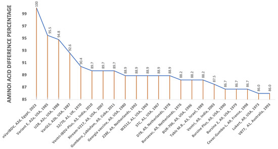 For a considerable period of time, vvIBDV has been the predominant circulating genotype of IBDV in Egypt, exhibiting both antigenically typical and modified patterns (with a single amino acid mutation at position 321 of VP2 situated within the loop PHI, 305–337 aa) during the last 15 years in Egypt. This has led to the emergence of Gumboro disease and acute mortality in susceptible chickens within 5–8 days of infection [24,64]. Genetic reassortment was observed in an isolate from Domiatta, Egypt in 2015 (No. 160019). VP2 was found to cluster with the vaccine strain, whereas VP1 clustered with vvIBDV (A1aB2). Furthermore, the phylogenetic analysis of nVarIBDV (OR682618 and OR682619 isolates) in this study showed typical identity (100%) with nVarIBDV strains (A2d) circulating in China, such as IBD/SD/LY/CN/01/2020 (OM307063), and 99.5% similarity with ZD-2018-1 (MN485882). In addition, three major aa mutations were detected in both nVarIBDV isolates (OR682618 and OR682619) as D213N which is responsible for immune escape [65], and D279N, and A321V, which are markers of reduced pathogenicity and altered antigenicity in variant strains [66,67]. Therefore, this new genetic variant (A2d) is added to the IBDV genotypes recorded in Egypt, which include A1aB1, A1bB1, A1aB2, A2d, A3B2, A3B1, A7B3 and A2dB1b [19,24,25,27,64,68,69,70,71,72]. It is well documented that nVarIBDV suppresses the immune system, hence indicating the economic importance of this hidden virus in the low performance of the affected flocks in association with secondary infections such as LPAI-H9N2, mycoplasma, Escherichia coli and necrotic enteritis (Clostridium perfringens). Although the flocks studied were vaccinated with both recombinant and live vaccines, the emergence of nVarIBDV strains highlights the importance of vaccinating breeder chickens with inactivated vaccines containing this novel variant strain. The percentage of genetic similarity in VP2-HVR of nVarIBDV, A2d, isolated in 2023 and other 18 vaccine strains (4 from A1, 2 from A3, 12 from A9, genotypes) ranged from 86 to 90.4% (Figure 5), with the highest similarity to Faragher 52/70 (A1) (Vaxxitek®), the recombinant vaccine strain, which may be insufficient to protect against nVarIBDV. Therefore, the use of inactivated vaccines containing nVarIBDV would be necessary to use in breeder chickens in order to effectively protect their offspring during the first 2–3 weeks of life. Finally, there are fears of future reassortment of A2d with A3 IBDV strains, creating a new genotype with increased pathogenicity, as has occurred in China [73].