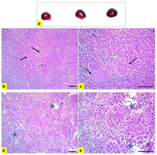 Postmortem, and histopathological lesions in spleen samples from chickens in flock no. 18. (a) Severe atrophy of spleen. (b,c) Severe depletion and rarefication of lymphoid follicles (black arrow). (d,e) Severe multifocal to diffuse areas of splenic necrosis (blue star). H and E stain; scale bar 100 μm. (b,d) ×200. (c,e) ×400.