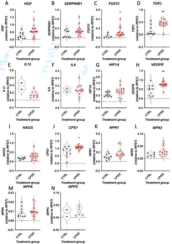 (A–N) Multiplex XP-PCR analysis of hepatic gene expression in cats with congenital portosystemic shunts (CPSS) compared with controls (CTRL). Data were normalised to the housekeeping gene (RPS7), and analysed by Mann-Whitney U test, with p-values represented as: * p < 0.05, ** p < 0.01) n = 18 for CPSS and n = 10 for control, although transcripts for every gene were not always detected in every sample).