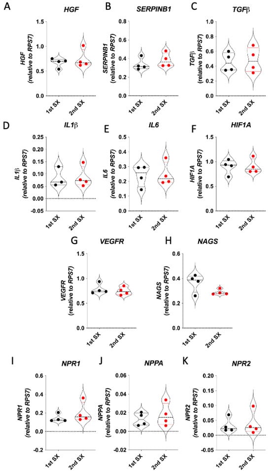(A–K) Comparison of hepatic gene expression in cats with congenital portosystemic shunts at time of first and second surgery. Data were normalised to the housekeeping gene (RPS7) and analysed by Mann-Whitney U test. There were no significant differences observed; n = 4 cats.
