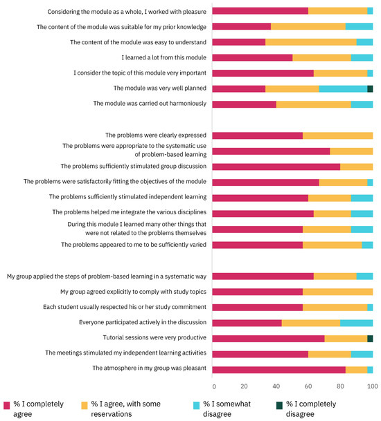 Percentage of students for each level of agreement regarding the module (first block), the problems (second block) and the group process and dynamics (third block) assessed by the Module and Problem Evaluation questionnaire (for exact percentages, see Table S7).