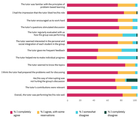 To assess students’ level of satisfaction with the different aspects of the PBL methodology (i.e., problems, module, tutor), students were asked to complete two questionnaires (Module and Problem Evaluation [34], and Tutor Evaluation [35]) within one day after the end of the module. In evaluating the tutor, students indicated their level of agreement (I completely agree; I agree, with some reservations; I somewhat disagree; I completely disagree) with statements regarding the perceived expertise, competence, and performance of the tutor. Through the Module and Problem Evaluation, students expressed their level of satisfaction with the modules’ and problems’ appropriateness and the group dynamics (the full questionnaires are available in the Supplementary Materials, Tables S4 and S5).