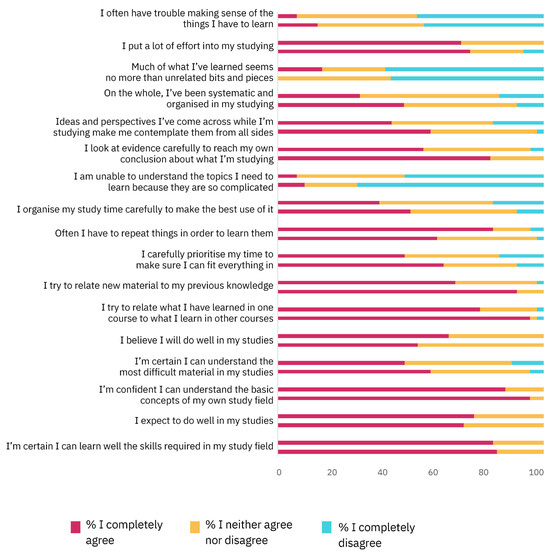 The questionnaire HowULearn [36] (Table S6) was administered to students the week before starting the PBL module, referring to the courses of the previous semester, and after the two-week PBL module. The HowULearn questionnaire was composed of several sections, assessing different aspects, namely, changes in students’ studying and learning styles and approaches (sections Studying and Learning I and II); university burnout focusing on exhaustion at university; cynicism toward the meaning of university, and sense of inadequacy at university (section Studying and Learning III); student’s perception of teaching activity organization and of requirements (section: Development of Teaching, composed of subsections organization and structure, teaching and learning, and requirements and assessment) and development of general life competencies (section: General Life Competencies). In the sections Studying and Learning I and II, Development of Teaching and General Life Competencies, students indicated their degree of agreement (I completely agree; I neither agree nor disagree; I completely disagree) for each statement of the questionnaire, whereas in the section Studying and Learning III, students were asked to choose the option that best described their situation.