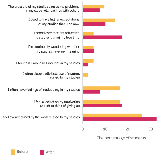 Figure 6 presents the results of the students’ answers about burnout related to studying and learning (Studying and Learning, section III), before and after the PBL activity. In both cases, the statement that describes the students’ situation the best was “I feel overwhelmed by the work related to my studies” (26.2% and 32.5%, before and after PBL, respectively). The statement which obtained the largest increase after the PBL activity was “I brood over matters related to my studies during my free time” (4.8% before, 17.5% after PBL), whereas the largest decrease was “I often have feelings of inadequacy in my studies” (16.7% before, 7.5% after PBL).