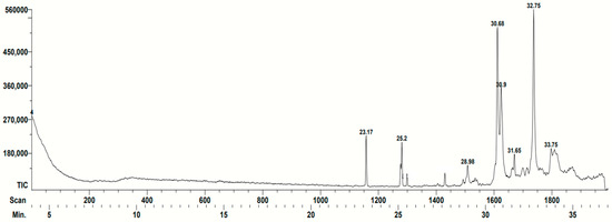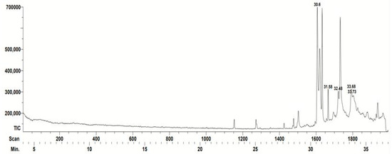 Gas chromatogram corresponding to the Scaptotrigona mexicana propolis. The retention time of each compound identified by the database is indicated (minutes): 30.6: 1,4-Methanocycloocta[d]piridazine, 1,4, 4a,5,6,9,10,10a-octahydro-11,11-dimethyl-,(1-alpha.,4-alpha,4a-alfa,10a-alfa)-; 31.58: Farnesol isomer a; 32.48: Ethanone, 1-(1,3a,4,5,6,7-hexahydro-4-hydroxy-3,8-dimethyl-5-azulenyl)-; 33.68: 2H-1-Benzoxacyclohexadecin-16(18aH)-one,3,4,5,6,7,8,9,10,11,12,13,14-dodecahydro-18,18a-dihidroxy-2-methyl; and 33.73: Furan-2,5-dicarbaldehyde. The characteristics of the compounds can be found in Table 1. Spikes that are not numbered were not identified by the team’s database.