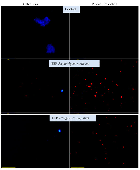 Effects of the EEPs of Scaptotrigona mexicana and Tetragonisca angustula on the clinical strain of Malassezia pachydermatis, as determined by fluorescence microscopy and dyeing with calcofluor-white and propidium iodide. Cultures were exposed to 21.3 mg/mL of EEP for 48 h at 28 °C. Alteration of morphology is observed with the calcofluor white stain. As in Figure 3, yeast samples stained in blue (calcofluor white) indicate the integrity of the cell wall (control), while those stained in red (propidium iodide) indicate damage to the cell wall. They do not stain in blue due to damage to the cell wall, which allows the entry of propidium iodide (red) (EEP exposed). The red colouration of propidium iodide in both extracts indicates greater damage to the yeast cells (40× magnification).