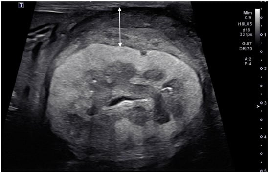 In the present study, kidney size was defined as the length of the maximum longitudinal axis of the kidneys and measured using the sagittal plane of the kidney. The subcapsular thickening layer was included as a part of the kidney if it was present on the longitudinal axis. Kidneys were evaluated as small if the maximum longitudinal axis was less than 3.0 cm, and renomegaly was determined if the maximum longitudinal axis exceeded 4.5 cm [].