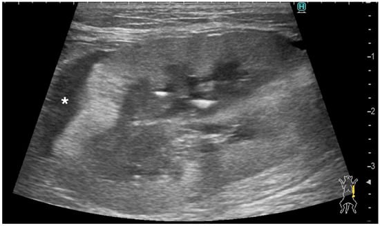 Renal hypoechoic subcapsular thickening, also known as hypoechoic subcapsular rim, is an ultrasonographic finding in cats. It is characterized by a hypoechoic, either circumferential or crescent-shaped band along the renal margin beneath the renal capsule []. This finding is most commonly associated with feline lymphoma [] and feline infectious peritonitis (FIP) [,].