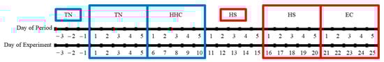 Visual representation of the experimental design. Cows (n = 6) were subjected to four experimental periods: (1) thermoneutral (TN; d 1–5), (2) TN + hyperinsulinemic–hypoglycemic clamp (HHC; d 6–10), (3) HS (d 16–20), and (4) HS + euglycemic clamp (EC; d 21–25). Cows were acclimated to tie stall housing and experimental procedures from d −3 to −1. Days 11 to 15 of the experiment served as a period for acclimation to HS.