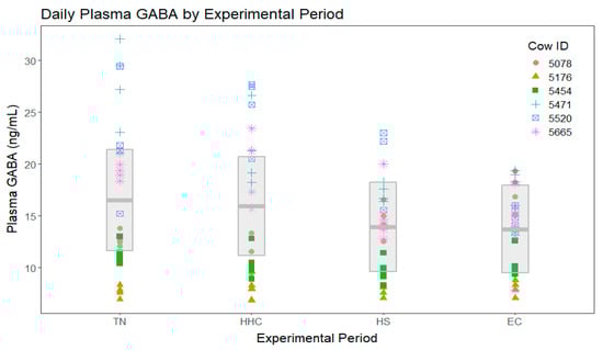 Plasma γ-aminobutyric acid (GABA) concentrations for all four experimental periods (TN = thermoneutral, HHC = hyperinsulinemic–hypoglycemic clamp, HS = heat stress, EC = euglycemic clamp). Different point styles and colors represent different individual cows, as represented in the figure legend. The gray box represents the model-estimated means (center line) for each group and their associated 95% confidence intervals. There were no significant differences detected when all four periods were included in the analysis (p = 0.11).