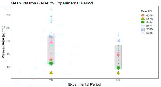 Plasma γ-aminobutyric acid (GABA) concentrations by period for the thermoneutral (TN) and heat stress (HS) periods only. Points of different shapes and colors represent different cows. Small points show the raw data. Large points show the raw mean values for each cow. The gray box represents the model-estimated means (center line) for each group and their associated 95% confidence intervals. Plasma GABA during HS tended to be reduced compared to the TN period (p = 0.06).