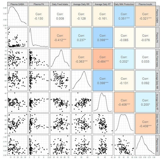 Correlogram showing the correlations between plasma γ-aminobutyric acid (GABA) concentration, plasma progesterone (P4) concentration, daily feed intake, average daily respiration rates (RR), average daily rectal temperatures (RT), and daily milk production in kilograms and the plasma insulin concentration. The bottom half of the graph shows scatterplots of each variable against the others, and the top half shows the Pearson correlation coefficient for each pairing. A correlation value marked with * shows that the p-value is <0.05; *** shows that the p-value is <0.01. The diagonal shows a density plot representative of the distribution of each variable.