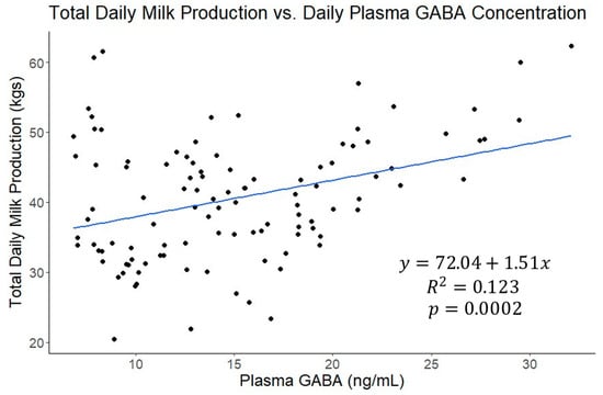 The linear fit of total daily milk production in kilograms versus plasma γ-aminobutyric acid (GABA) concentration from all four experimental periods. Plasma GABA was a significant predictor of milk production, but not sufficient by itself to explain a substantial portion of the variability in milk production.