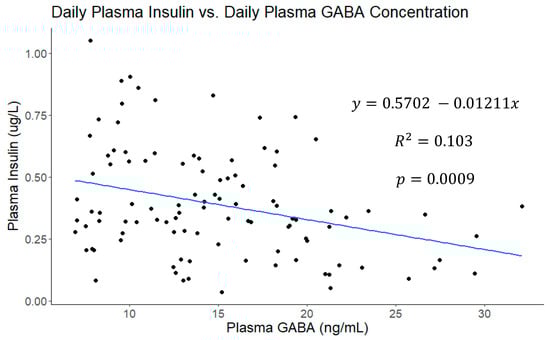 Several studies have demonstrated that perfusing the pancreatic cells with GABA or GABAA receptor agonists does impact the release of insulin from the pancreas [,,], and Feng and co-workers [] showed that administering GABA to mice treated with streptozotocin to induce type I diabetes largely restored insulin levels. Taking these results into account, there is reason to think that alterations in plasma GABA levels, no matter their origin, should impact insulin secretion from the pancreas. However, the correlational analysis of plasma GABA and plasma insulin presented in this work suggests that the impact may be much smaller than that of other endocrine or nervous changes yet to be investigated.