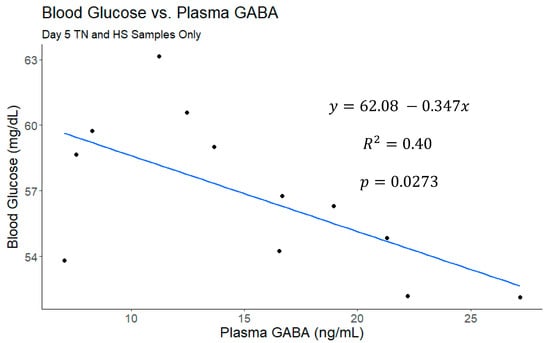 The linear fit of blood glucose versus plasma γ-aminobutyric acid (GABA) from day 5 of the thermoneutral (TN) and heat stress (HS) periods. No other samples were included because glucose measurements were only collected concurrently with GABA measurements on these days. This comparison yielded a moderate correlation, and the model including baseline GABA was significantly better than the intercept-only model.