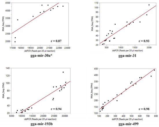 A randomly selected small set of miRNAs was subjected to ddPCR analysis using custom-designed primers (Table 1). The absolute quantification of the four randomly selected miRNAs in the same sets of total RNA samples by ddPCR was analyzed against the corresponding normalized PF reads (TPM) of the small RNA sequence reads data with a bivariate model. The correlation coefficients between the two sets of expression data for the examined miRNAs ranged from r = 0.87 to r = 0.98, with a statistic of p < 0.001 (Figure 1). This provided highly positive support in validation of the small RNA sequence reads data generated in this study and the estimates of the miRNA expression derived from the small RNA sequence datasets.
