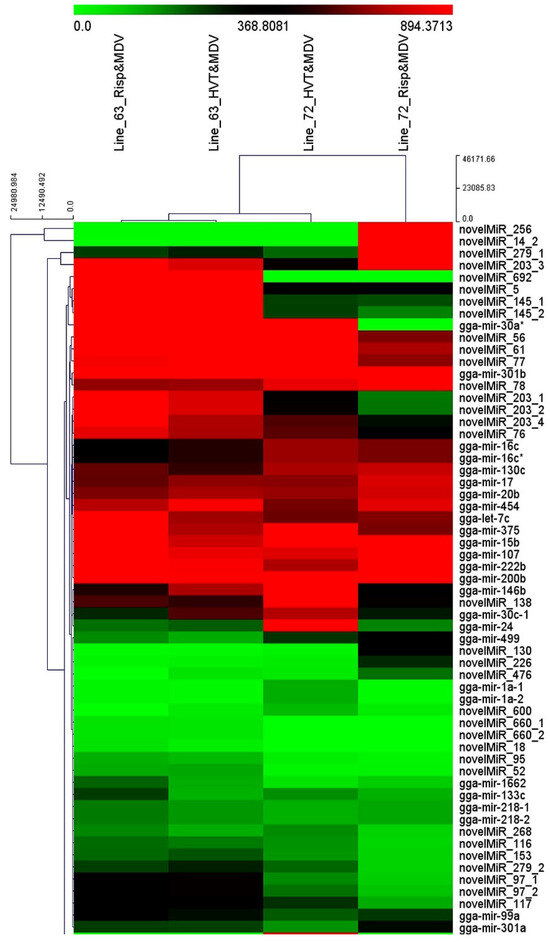 A heatmap graphically demonstrating the identified miRNA expression levels among the four treatment groups. A subsample of identified miRNAs from each of the four line-by-vaccine and MDV treatment groups—line 63 vaccinated with HVT or CVI988/Rispens (Risp), and line 72 vaccinated with HVT or Risp (all followed by Marek’s disease virus challenge)—are plotted to illustrate the expressional differences (normalized counts) and similarities. The expressional levels of the identified miRNAs of the line 63 Risp-vaccinated and MDV-challenged treatment groups were most distant from the Risp-vaccinated and MDV-challenged line 72 group; the line 63 and line 72 HVT-vaccinated MDV-challenged treatment groups did differ from each other, but both were more distant from the Risp-vaccinated MDV-challenged line 72 than the line 63 Risp-vaccinated MDV-challenged treatment groups.