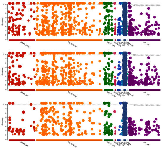 A total of 2035 and 2134 target genes were predicted for the differentially expressed miRNAs of line 63 and line 72 birds, respectively, in response to the HVT vaccination followed by MDV challenge treatment in contrast to each line’s control group. These target genes were highly enriched in a total of 1729 and 1739 GO terms and pathways, respectively. The target genes were highly enriched in biological process (BP) and molecular function (MF) terms in common between the two HVT-MDV treatment groups of the two chicken lines (63 and 72). The BP terms included the following: (a) cell and cellular processes like cell adhesion, communication, development, differentiation, migration, cell morphogenesis, motility, cell death, cell–cell and Wnt signaling, cell surface receptor signaling pathway, cellular component processes including homeostasis, assembly, biogenesis, morphogenesis, cellular localization and metabolic process, cellular response to stimulus and stress; (b) epithelial processes, like cell differentiation, tube morphogenesis, and development; (c) immune system development; (d) intracellular processes, like protein transport and signal transduction; and (e) negative and positive regulation involving cellular processes, signal transduction, signaling, transcription, apoptotic process, cell communication, gene expression, intracellular signal transduction, and protein phosphorylation. The MF terms included binding processes like ATP binding, DNA bindings, enzyme binding, identical protein binding, kinase and lipid bindings, nucleic acid and nucleotide bindings, protein and protein domain-specific bindings, signaling receptor binding, and small molecule binding. There was a total of 182 GO terms enriched exclusively with target genes of the line 63 HVT-MDV treatment group. Those GO terms included a variety of channel activity terms like ion and calcium channel activity, gated channel activity, and voltage-gated channel activity, and transmembrane transport activity like active transmembrane transporter activity and monovalent inorganic cation transmembrane transporter activity under the MF category. More GO terms under the BP category were observed, which included angiogenesis, regulation of response to external stimulus, Wnt signaling pathway, negative regulation of cell motility and migration, cell–cell adhesion, immune system process, and transmembrane receptor protein serine/threonine kinase signaling pathway (Tables S6 and S7). The GO terms for each of the functional categories, which were enriched with target genes of differentially expressed miRNAs of the line 63 and line 72 HVT-vaccinated treatment group and MDV-challenged treatment group of birds, are visually depicted in the top and middle Manhattan-like plots in Figure 4, respectively.