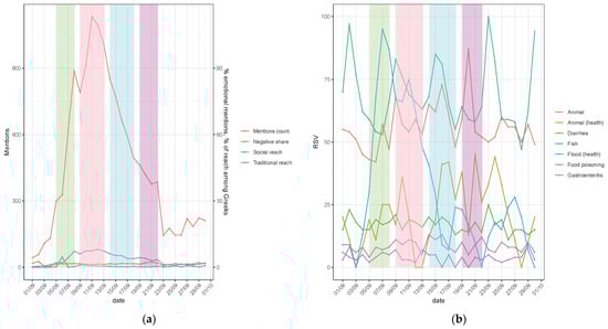 (a) The flood in traditional and social media daily (extracted using Brand24). Daily count of mentions and their reach. (b) Google search queries as normalized daily values (relative search volume, RSV). Colors represent the following phases: (i) weather change and storms (green); (ii) acute flood (pink); (iii) recovery after main flood (blue); and (iv) disease outbreaks (purple).