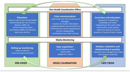 To mitigate the impacts of disasters on wild, livestock and companion animals, it is essential for the authorities in charge to not only have emergency plans in place [21] but also to possess crisis communication skills [22] and action plans for the local communities in this matter (Figure 3). There is a global change in the perception of crises (which we are likely to experience increasingly due to climate change [14,15]), but more research using the social sciences is needed locally to understand local vulnerabilities and resilience. This includes early warning systems or media monitoring activity during a catastrophic event. Our flood case study underscores the pivotal importance of crisis management in shaping public responses to veterinary public health measures in the so-called two-way communication [22]. These evaluations bolster the case for adopting best practices in risk communication [8], which include integrating risk communication strategies into policy formulation and accommodating media requirements for proactive planning before events (see PRE-CRISIS (Figure 3)). Veterinary officers must be aware of what may drive the interest of the public in their regions. The perception of diarrhea in humans or animals will be more important than the introduction of (re-) emerging or long-term contamination, thus the mismatch between priorities of public health specialists and lay people will be different [9]. Moreover, at least in Thessaly (which does not need to be the case in other settings [7]), the bias of the interest in companion animals in the social/local media may suggest whose voice may be the loudest in the next catastrophe. Thus, mapping the typical needs of the local population will be crucial for an adequate response, and it cannot be conducted without setting up a media monitoring system (other sociological methods, such as surveys or individual/group interviews, may have only supplementary roles). In the CRISIS CUMULATION phase, a response to community apprehensions and feedback from animal owners/breeders about where and how to safeguard or displace is needed through social and local media. From social media listening, the places of animals in need can be detected, and this information may be an additional layer to conventional channels [2]. Quick animal displacement and safeguarding advice should be given to residents of affected regions (see the Australian example [21]). In the LATE CRISIS phase, conveying messages with care and understanding, maintaining and recognizing uncertainties and offering practical advice for Internet communities to follow are crucial (as in our case, the supplementation of vitamins among dogs that have eaten dead fish). Social media listening would show information about current infectious outbreaks, and veterinarians could not only quickly detect problems [11] but could also provide some veterinary advice through social media (some equivalent to distance diagnostics and treatment in crisis situations).