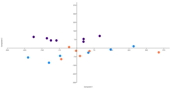 Scatterplot of principal component analysis (PCA) with the three local chicken breeds. Every sign represents a sample, and every color represents a breed (turquoise = Bianca di Saluzzo; orange = Bionda Piemontese; violet = Pepoi).
