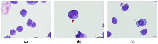 Autologous blood samples from four healthy dog donors (No. 1, four-year-old, male, castrated Standard Poodle; Nos. 2–4, four-year-old, female intact Greyhounds) were collected, and representative infusion cells were obtained under the same culture conditions described above. Phenotype of the representative cell sample was analyzed by AccuriTM C6 flow cytometry (BD, Heidelberg, Germany). The FITC-conjugated mouse anti-dog CD3, PE-conjugated rat anti-dog CD5, and Alex647-conjugated mouse anti-dog CD21 antibodies (all from Bio-Rad, Hercules, CA, USA) were used to stain the representative cell samples. A small cell pellet from donor No.1 was prepared for cytology and stained by the Wright–Giemsa method for cell morphology review.
